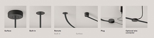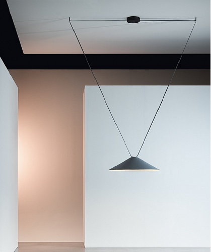 Для подвеса требуются ленты доступные в четырех цветах (черный, терракотовый, синий и зеленый) и дополнительные аксессуары (см. на фото). Направленное диффузионное освещение излучает мягкий свет, который генерирует низкий контраст между освещенными участками и отбрасываемыми тенями.