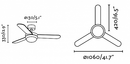 Изготовлен из стали и матового стекла с лопастями из фанеры. Регулируемая скорость с 10-21-41Вт и 80-145-180 оборотов в минуту в зависимости от скорости. Возможен монтаж на наклонные потолки. Этот вентилятор оснащен функцией реверса. Сменные лопасти.