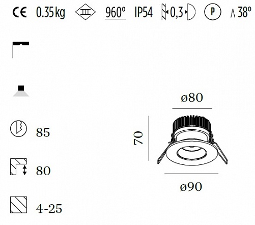 Толщина потолка 4-25мм. Минимальное расстояние до освещаемой поверхности 0.3м.