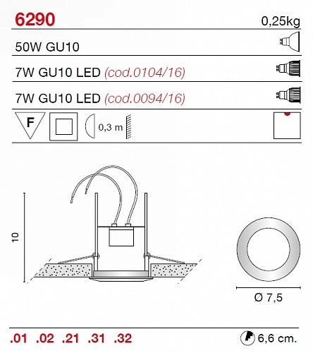 Световой прибор со вторым классом защиты с двойной или армированной изоляцией. Может монтироваться на горючую поверхность. Минимальное расстояние до освещаемой поверхности 300мм.